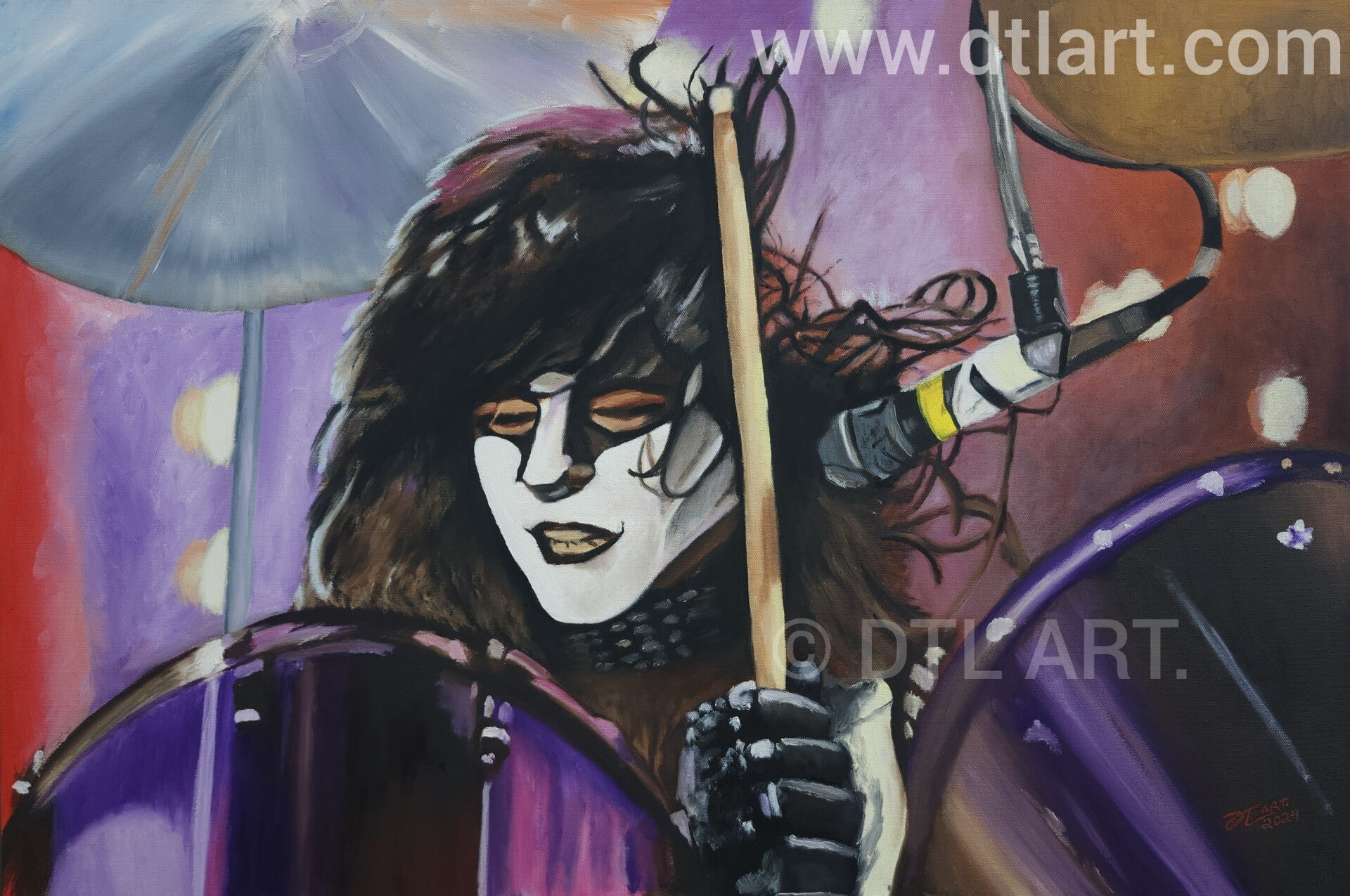 An oil painting honoring the late Eric Carr of KISS. In his iconic fox makeup from the early 80s. His heavy hitting drums and energetic playing made him a fan favorite for many years.